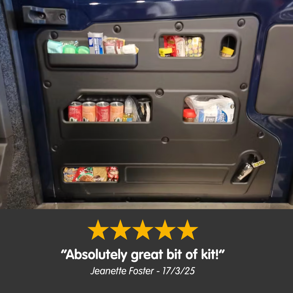 Massimizza lo spazio di archiviazione nel tuo Ford Transit Custom (2018 facelift - 2023) con il Kiravans DoorStore, una soluzione elegante e facile da installare che trasforma la tua porta scorrevole in un pratico e accessibile spazio di archiviazione. Realizzato in plastico ABS resistente con finitura OEM, si installa in pochi minuti utilizzando le fissazioni esistenti—nessuna perdita di spazio abitativo, solo ulteriore spazio di archiviazione immediato!