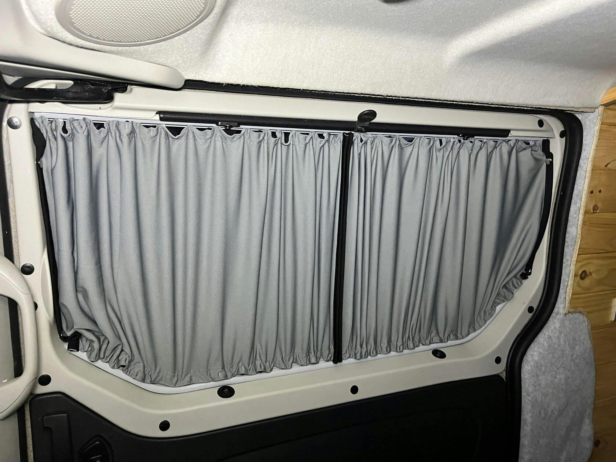 Le nostre tende universali sono disponibili in nero standard, grigio standard o oscuramento totale premium. Le tende Kiravans Premium Blackout per camper sono a doppio strato e garantiscono un'eccezionale isolamento termico e una copertura finestra più scura rispetto alle tende standard. (Non è possibile ottenere un oscuramento totale con un tessuto elastico, quindi la luce solare intensa è ancora leggermente visibile). Hanno una finitura nera da un lato e grigia dall'altro.