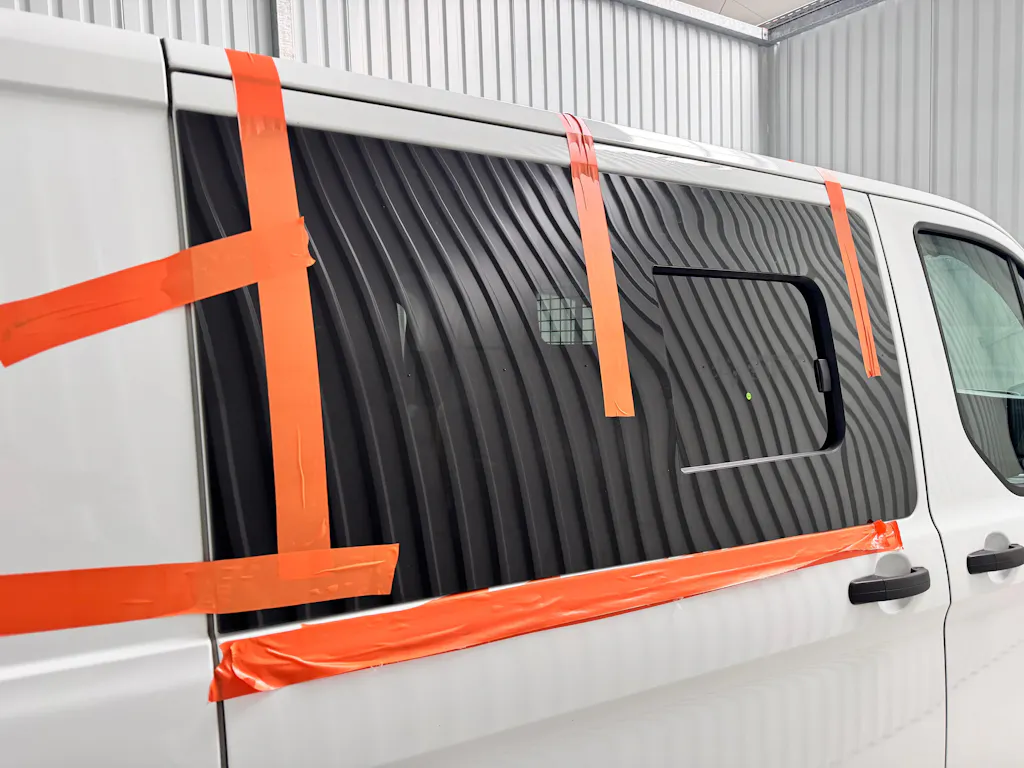 Fritted Glass - The black ceramic 'frit' paint pattern on the inside of the glass prevents visibility of any cut metal from the outside of your van conversion